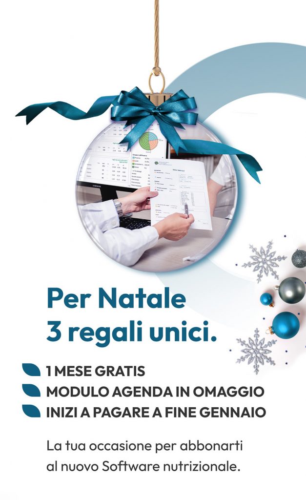 Abbonati ora al Software nutrizionale per avere regali unici: formula all inclusive con pazienti illimitati, 1 mese di abbonamento gratuito e Modulo Agenda in regalo. Inoltre pagamento posticipato a gennaio!